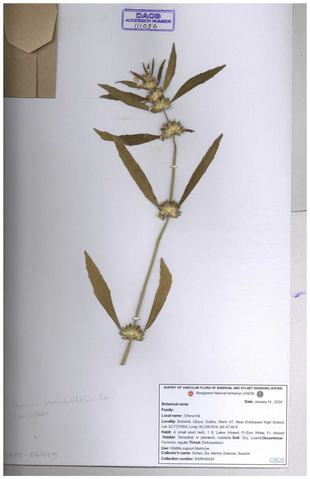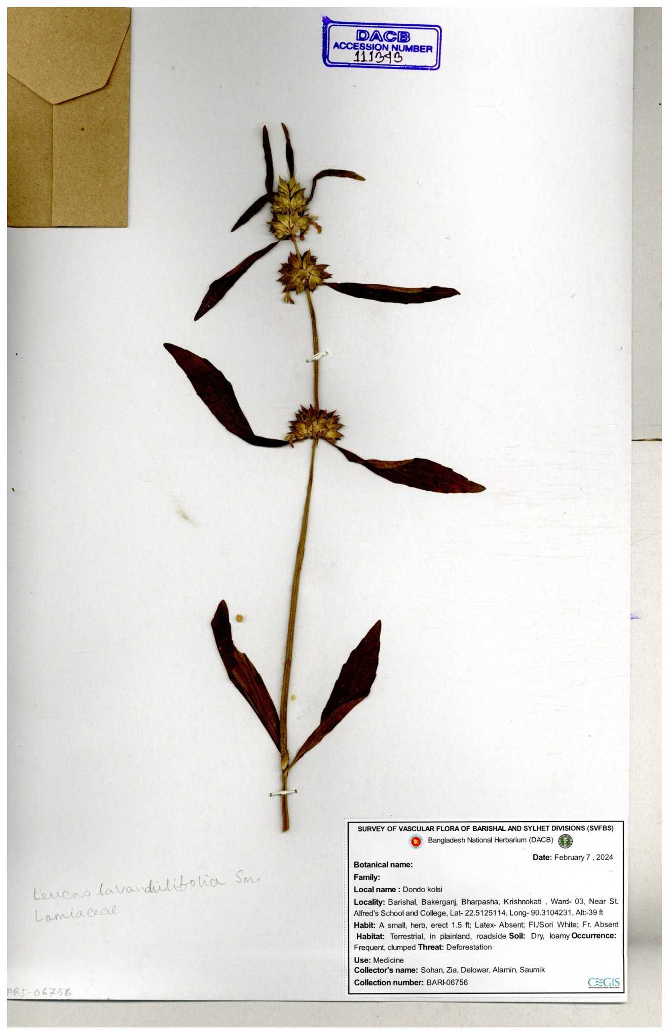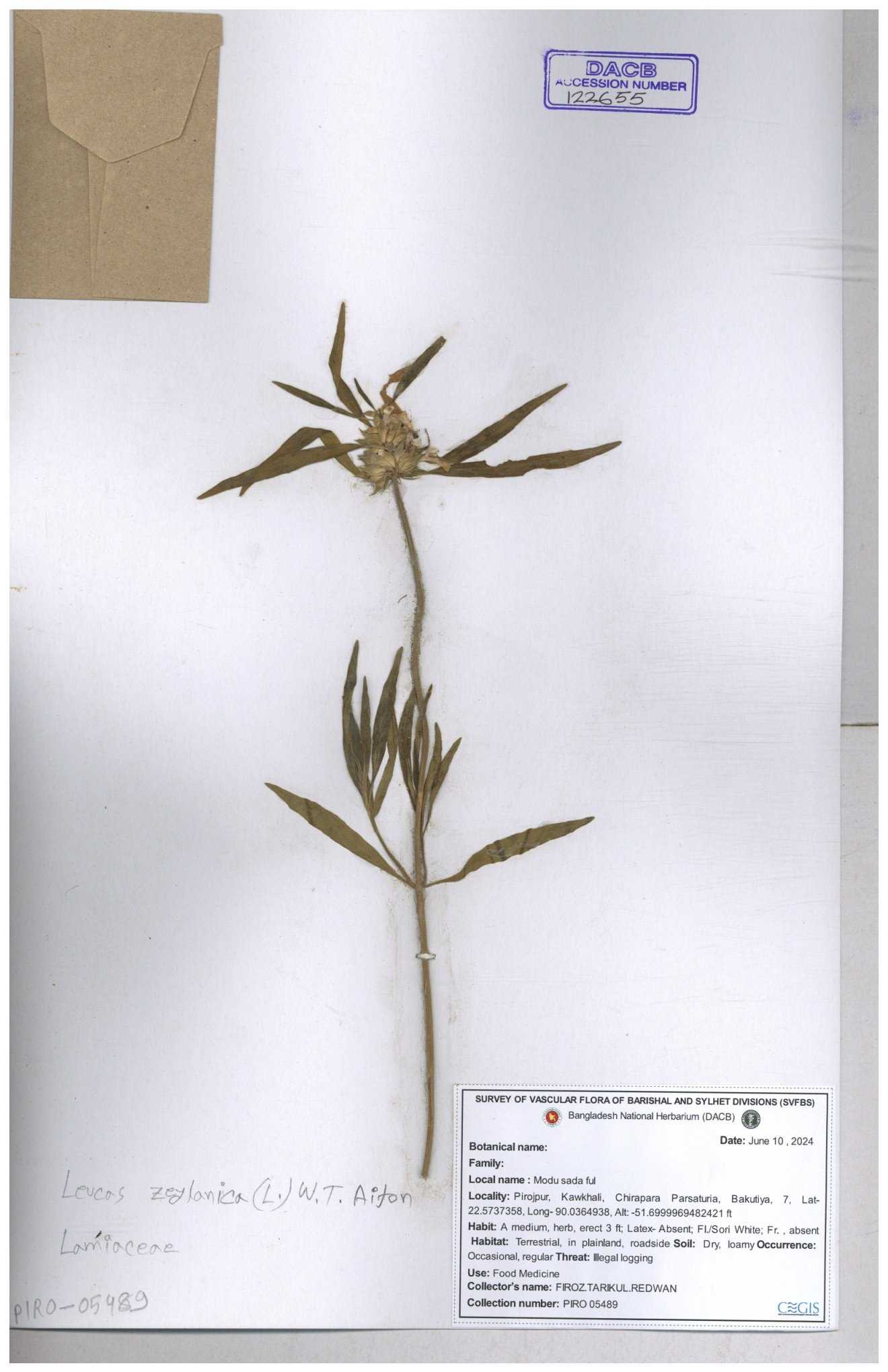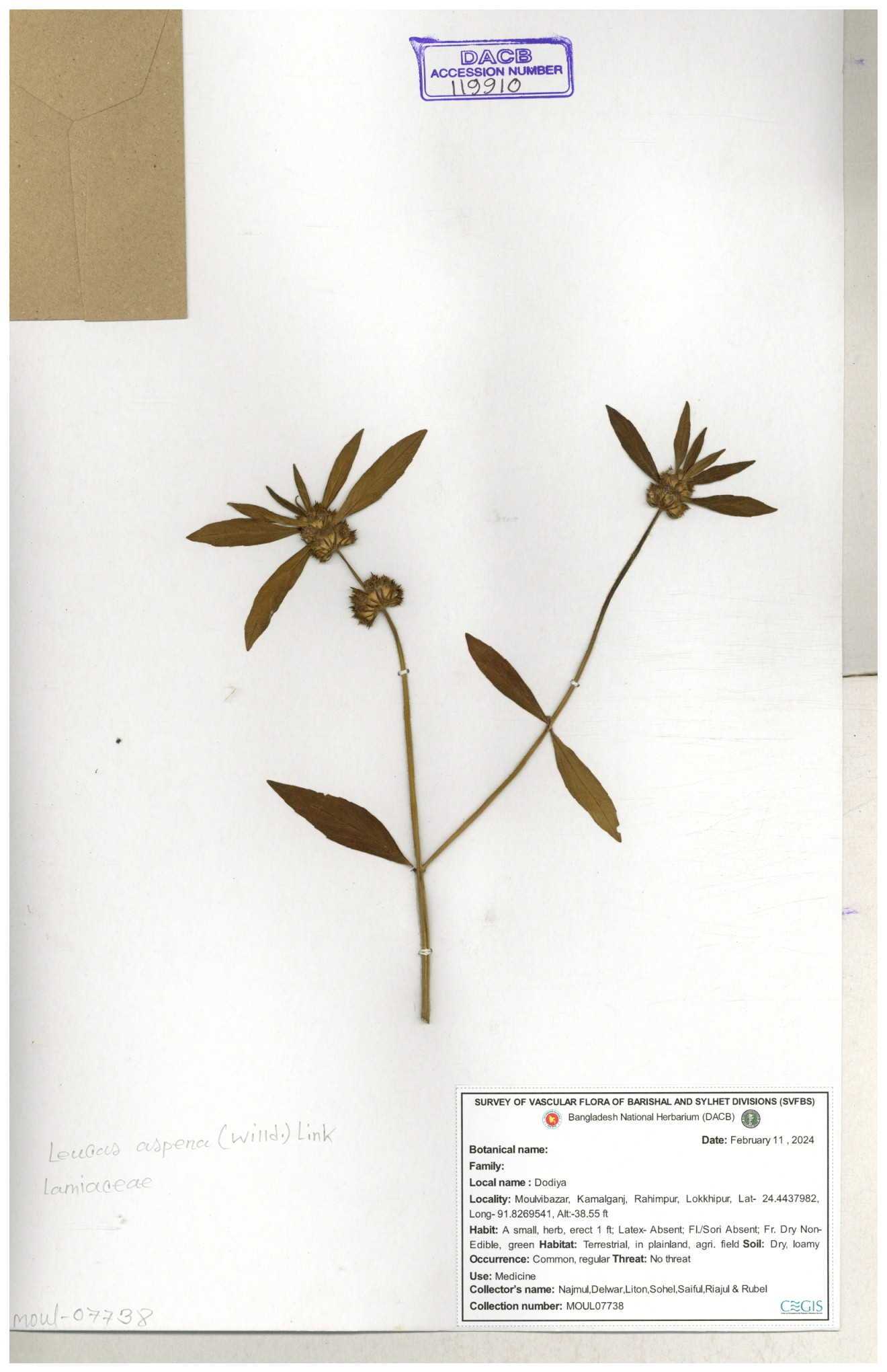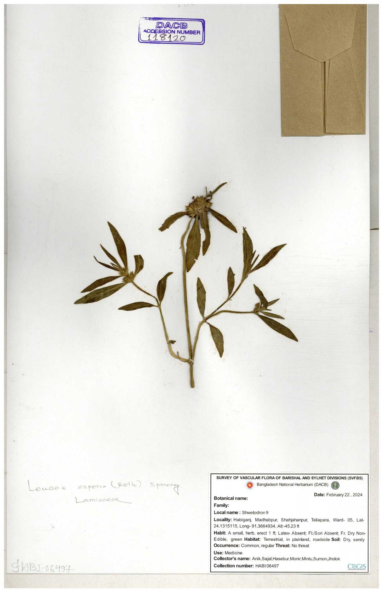 | 65959 | Lamiaceae | Leucas zeylanica (L.) W.T.Aiton | Domkolos | Khandakar Kamrul Islam | KKI-4020 12-02-2020 |
