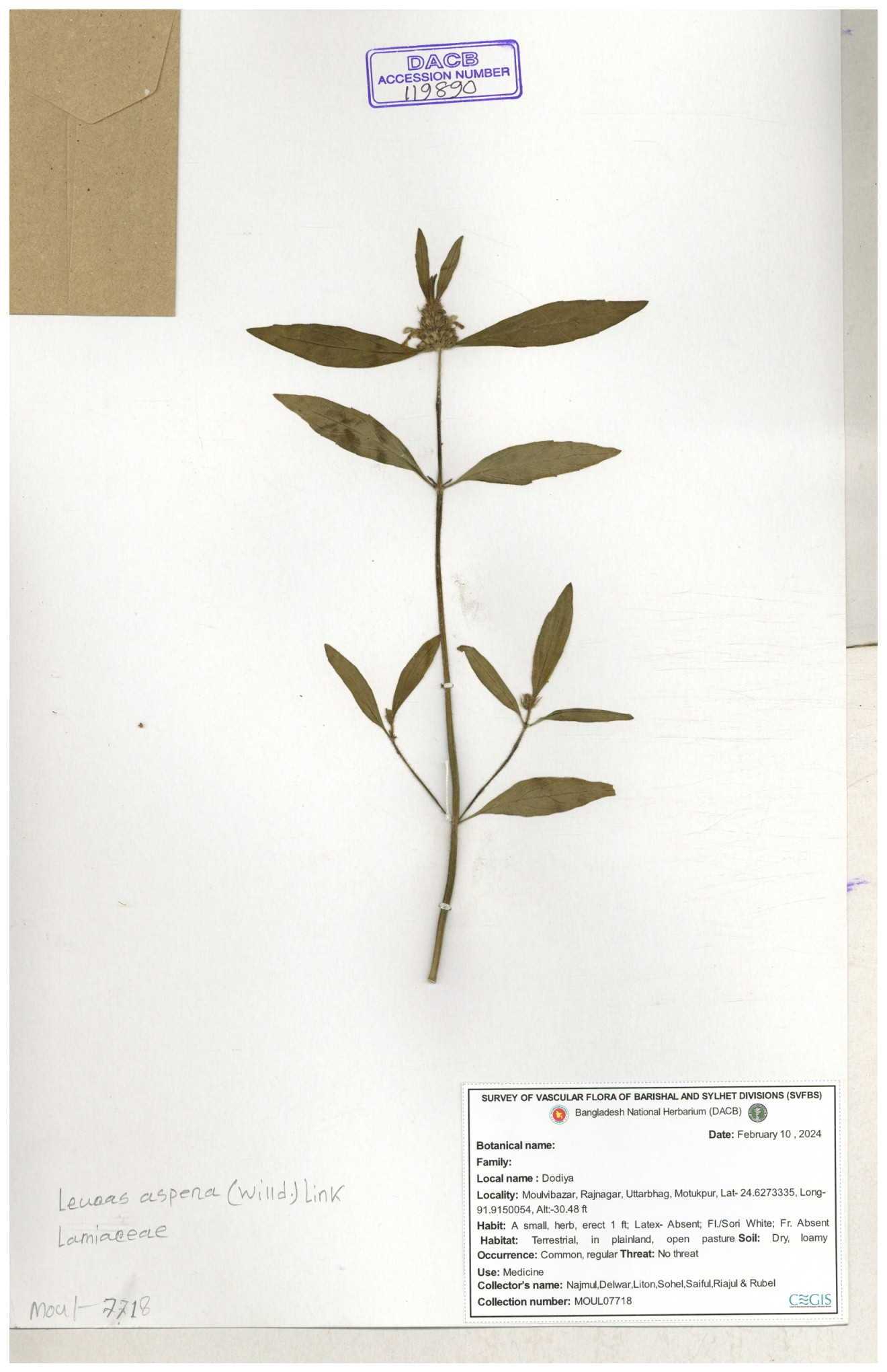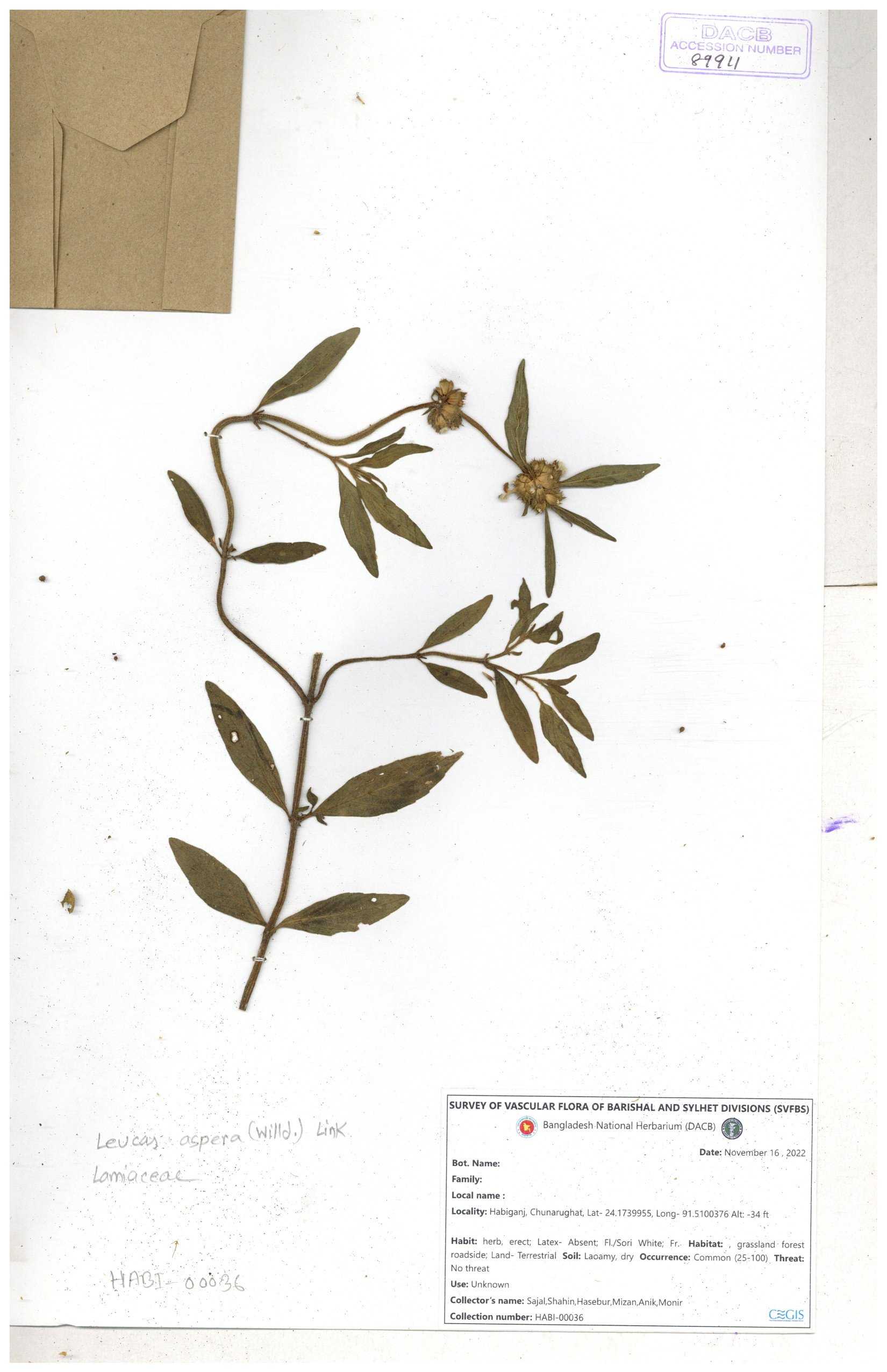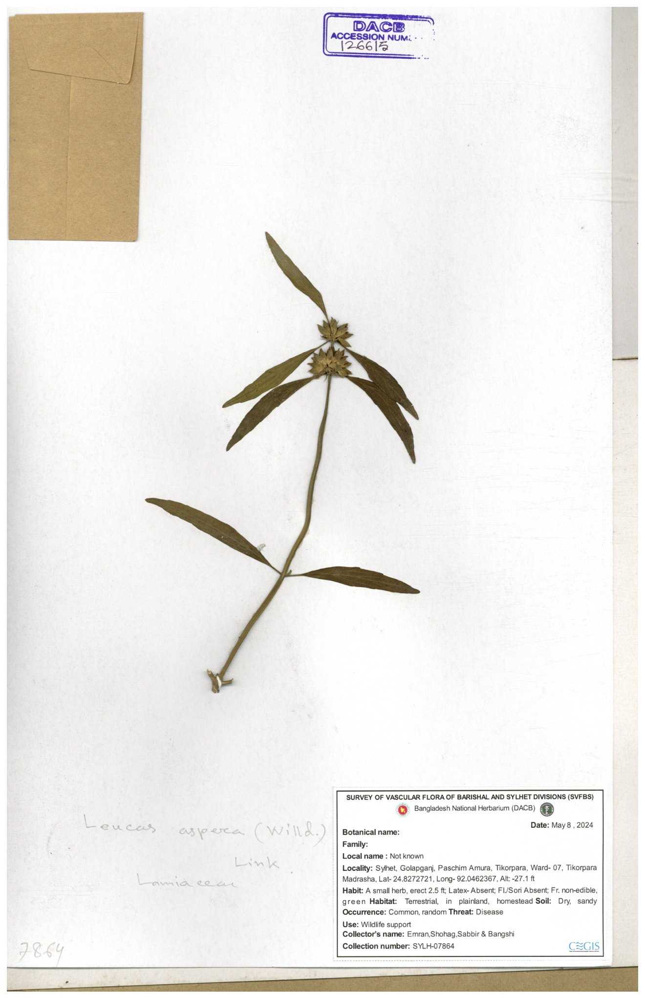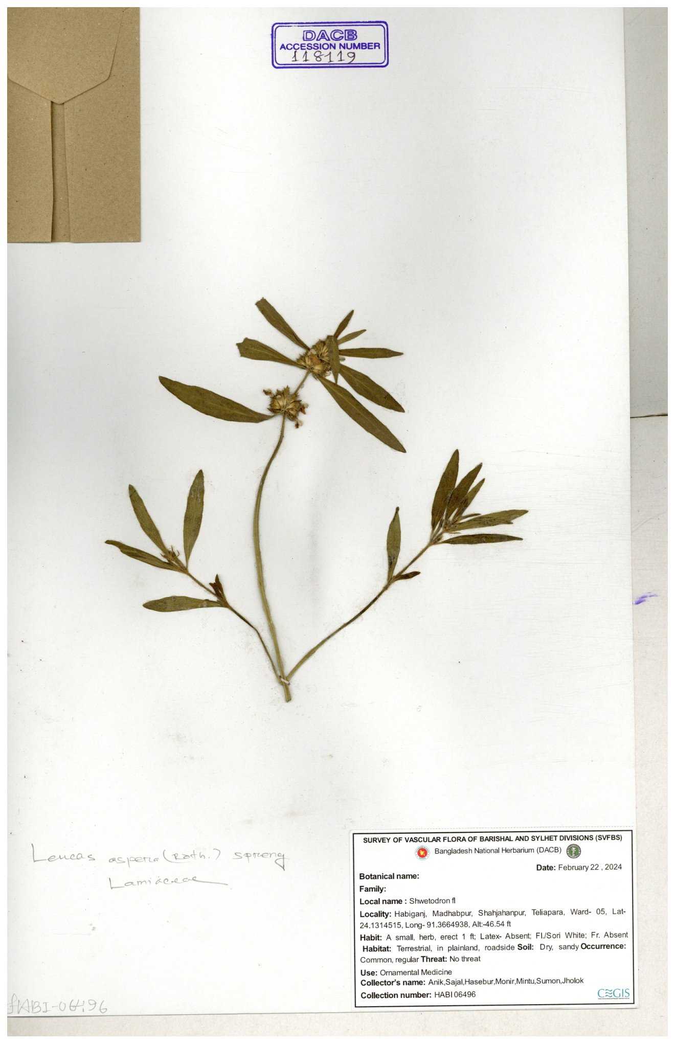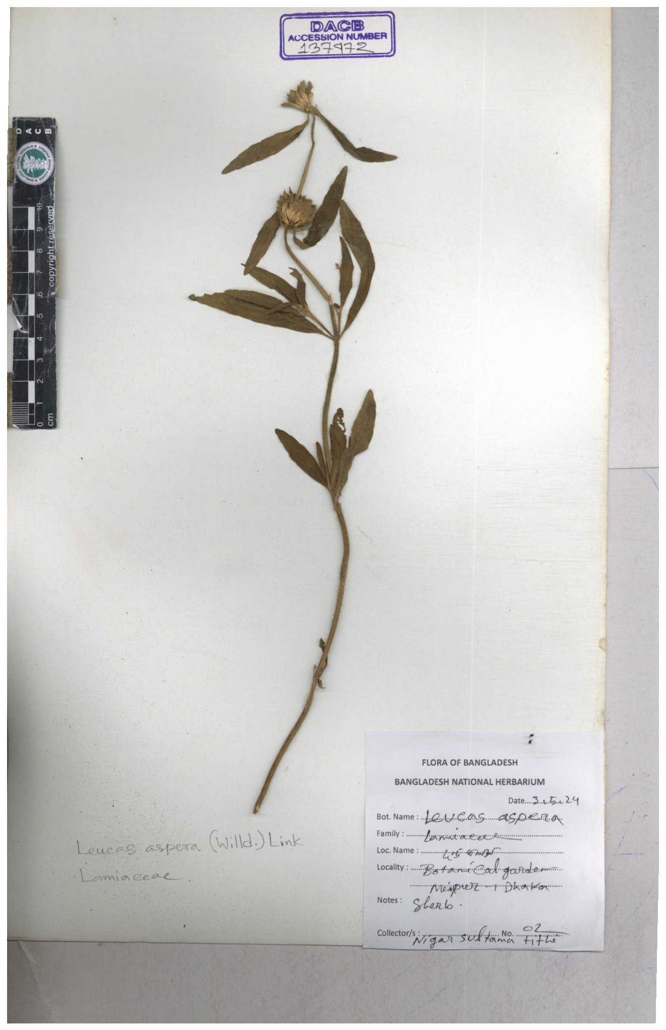 | 60956 | Lamiaceae | Leucas aspera (Willd.) Link | Niyamul Kabir, Zahid Hasan, Mehedi Hasan | NK-4816 09-10-2017 |